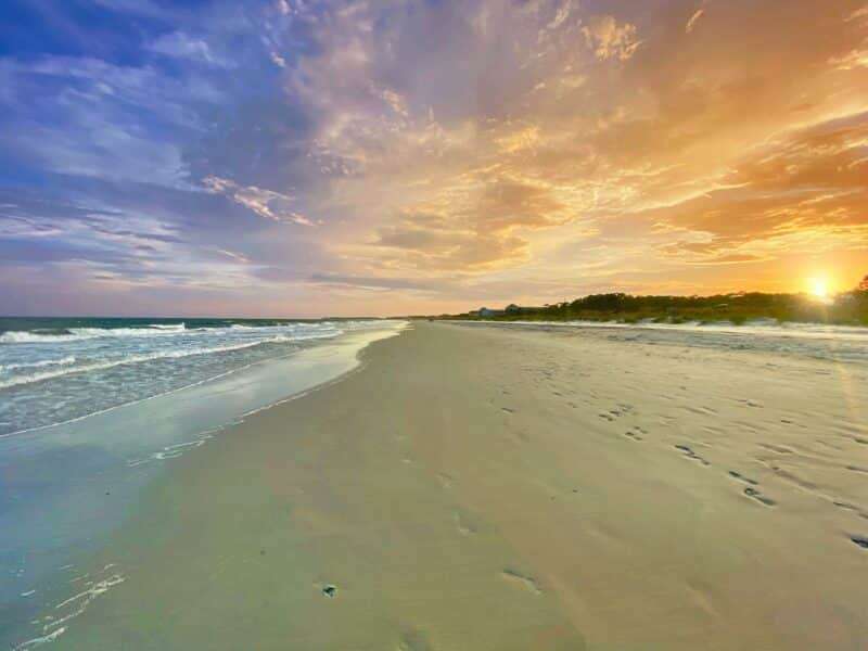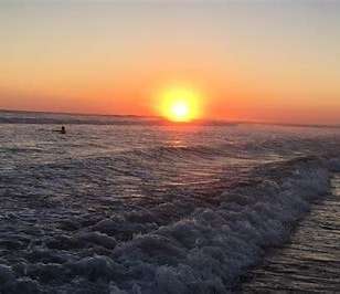 Long stretch of sand at Barra Vieja Beach with beachfront palapas and strong Pacific surf under a golden sky.