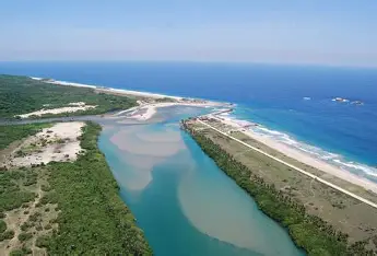 Expansive lagoon and beach at Playa Corralero, Oaxaca, known for bird sanctuaries and ancestral fishing
